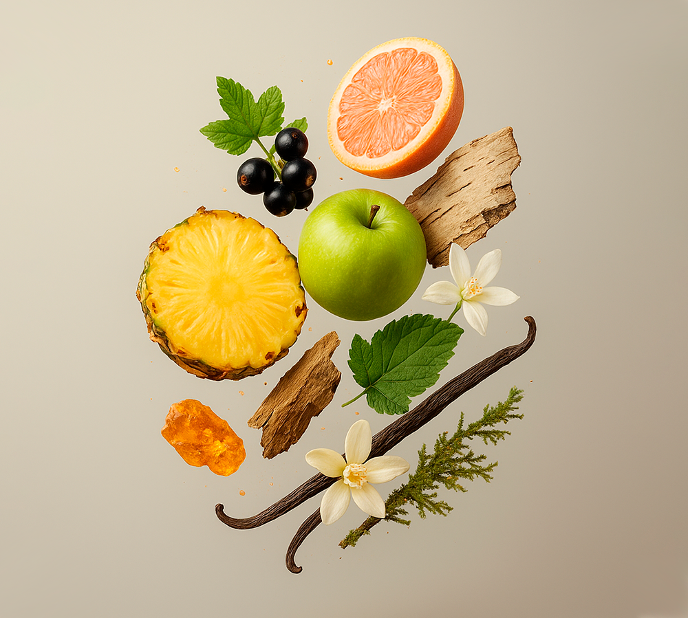 A sua composição abre com uma explosão de frescura cítrica e frutada, onde o Abacaxi e a Bergamota se destacam, envoltos pela acidez da Groselha Negra e da Maçã. Esta abertura revigorante capta a atenção de imediato.
