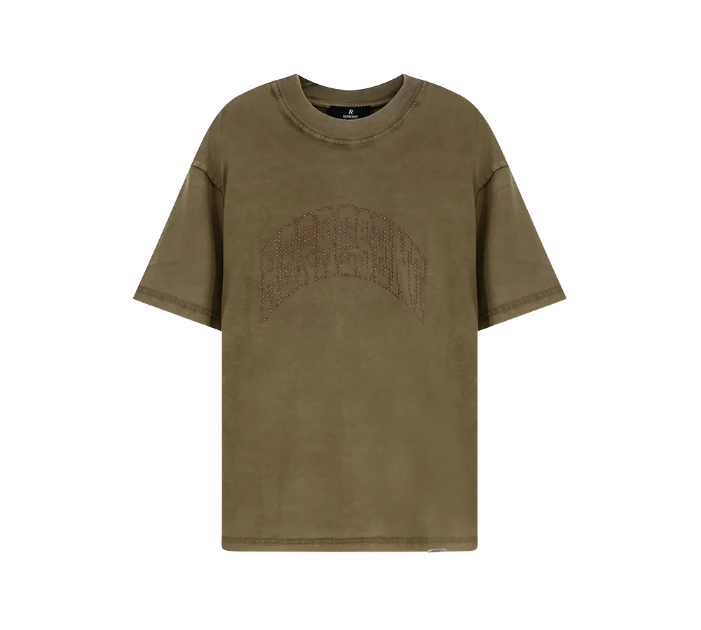 A Represent Embellished Represent T-shirt na cor Green é uma peça de destaque que eleva o conceito da t-shirt gráfica para o domínio do streetwear de luxo. Confeccionada em algodão de alta gramagem com um toque macio e lavagem vintage, esta peça apresenta o característico corte oversized da marca, com ombros descaídos e uma gola canelada ajustada. O grande diferencial de design reside no logótipo "Represent" no peito, decorado com detalhes brilhantes ou em relevo que criam um contraste luxuoso sobre o tom verde profundo, conferindo uma textura única e uma estética visualmente rica que combina a herança britânica com um acabamento sofisticado.