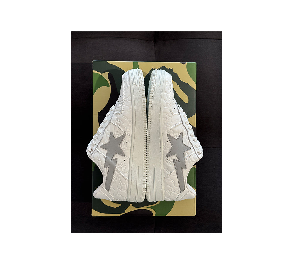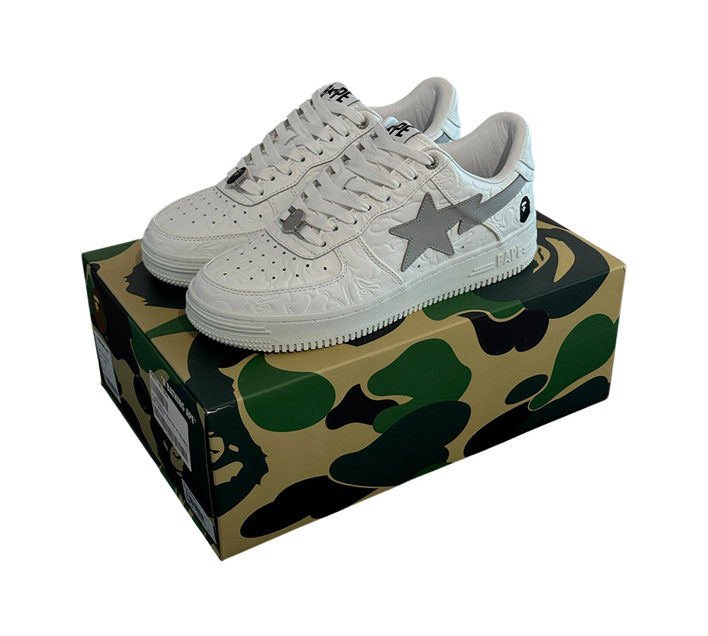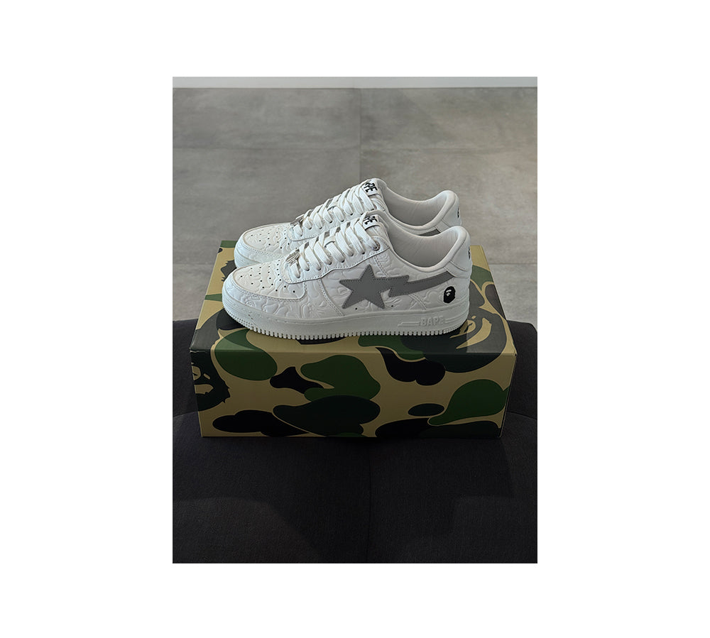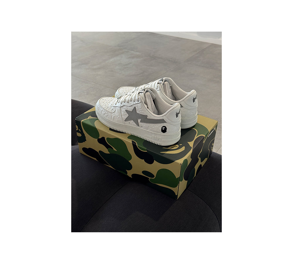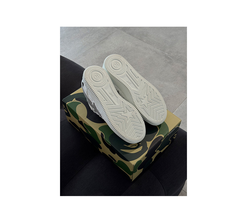 Bape Sta clássicos com painéis em camuflado sobre base branca, num tamanho 41. Uma peça icónica do streetwear japonês, em excelente estado usado, pronta para dar cor (e história) ao teu rotation.