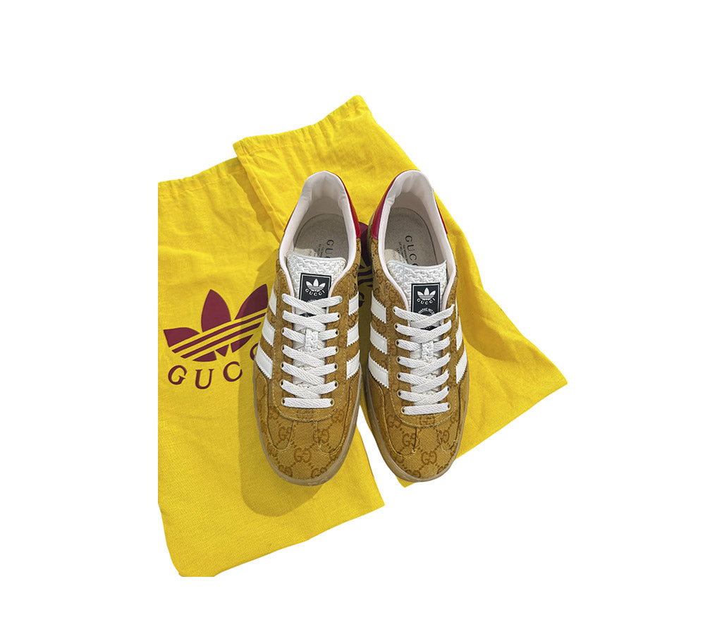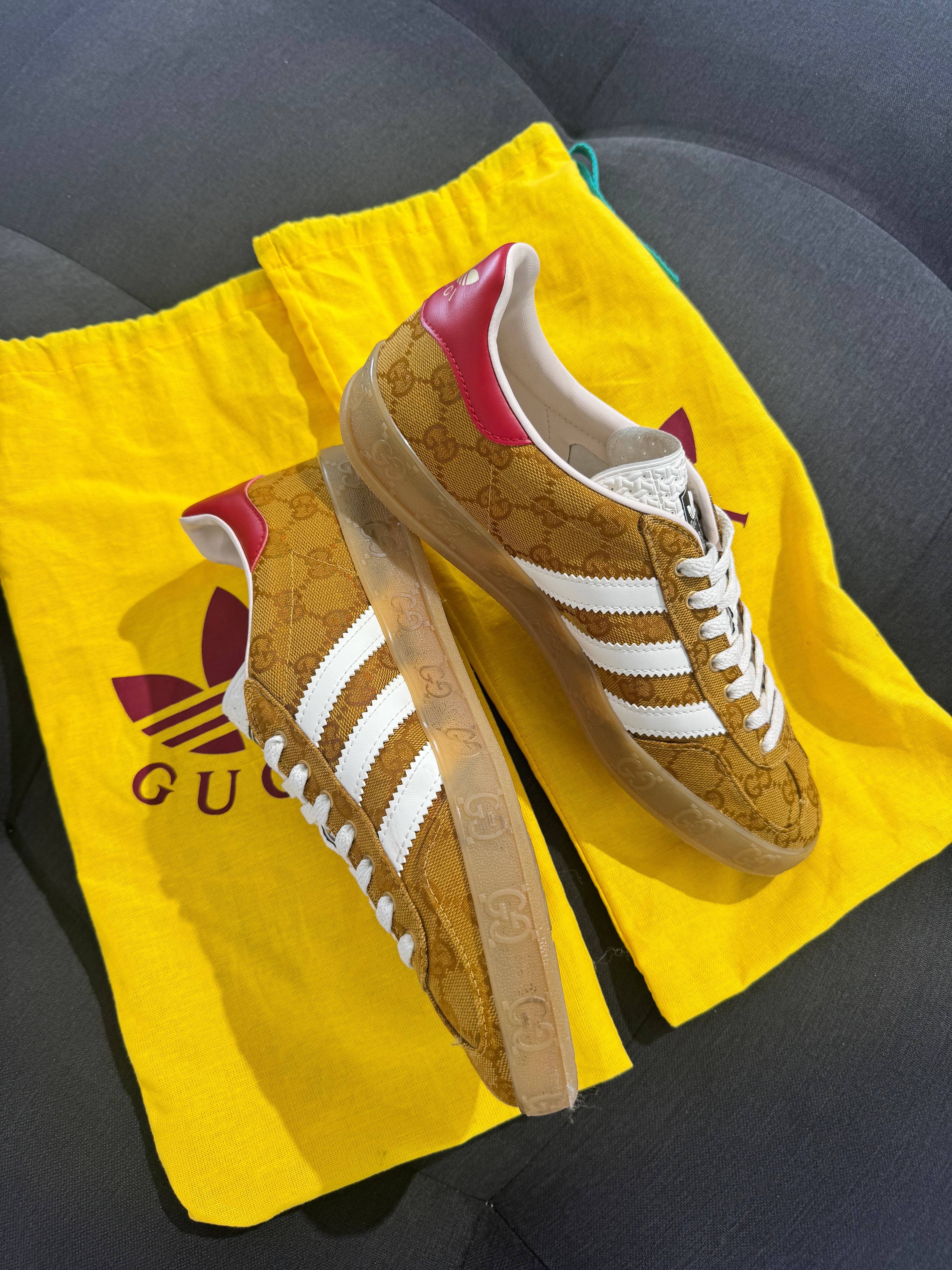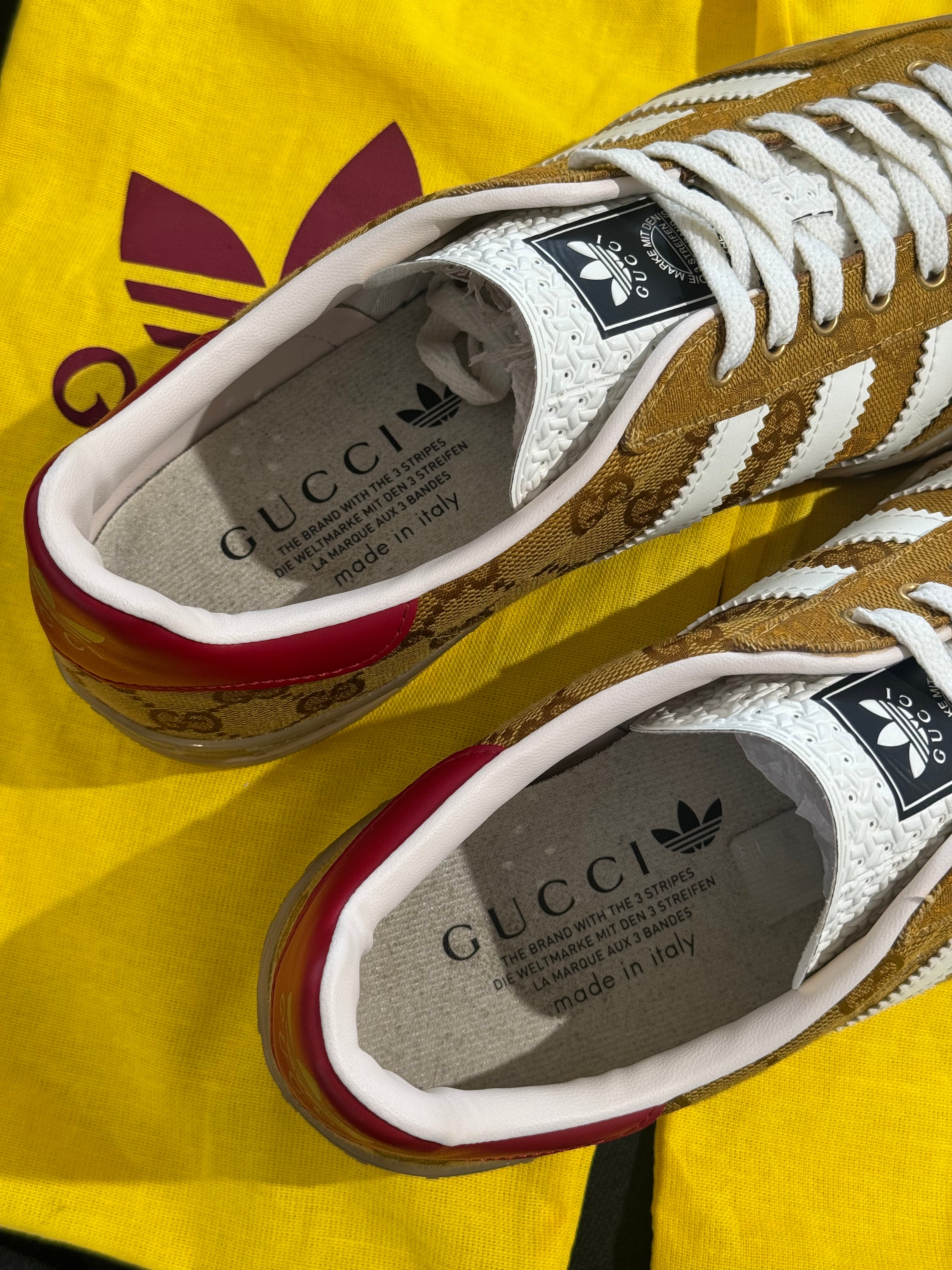 Fruto da colaboração entre adidas e Gucci, estas Gazelle em tamanho 42 elevam o clássico sneaker com o monograma GG sobre base bege e castanha. O resultado é um híbrido entre herança desportiva e luxo italiano, perfeito para quem quer vestir streetwear com pedigree.