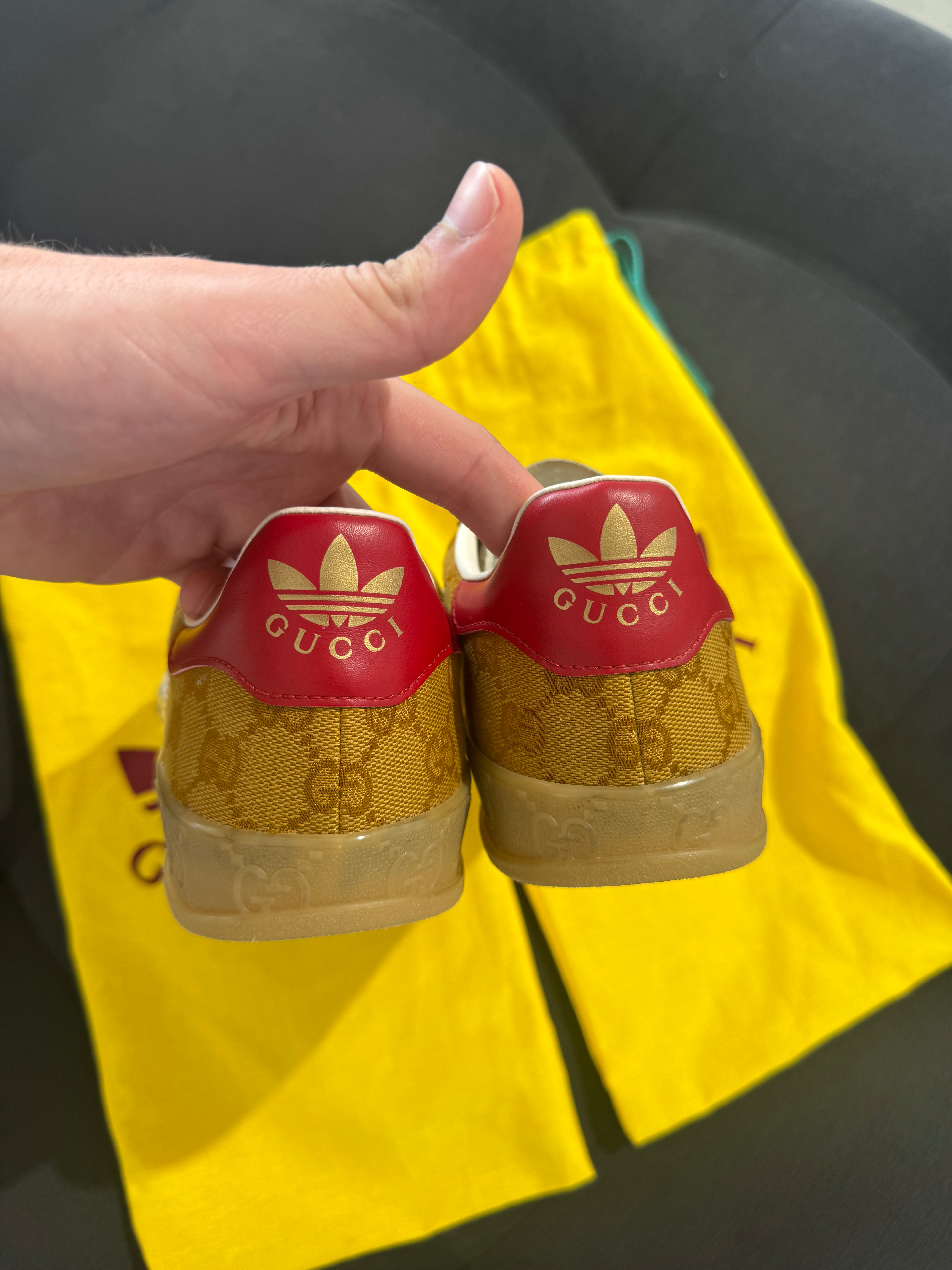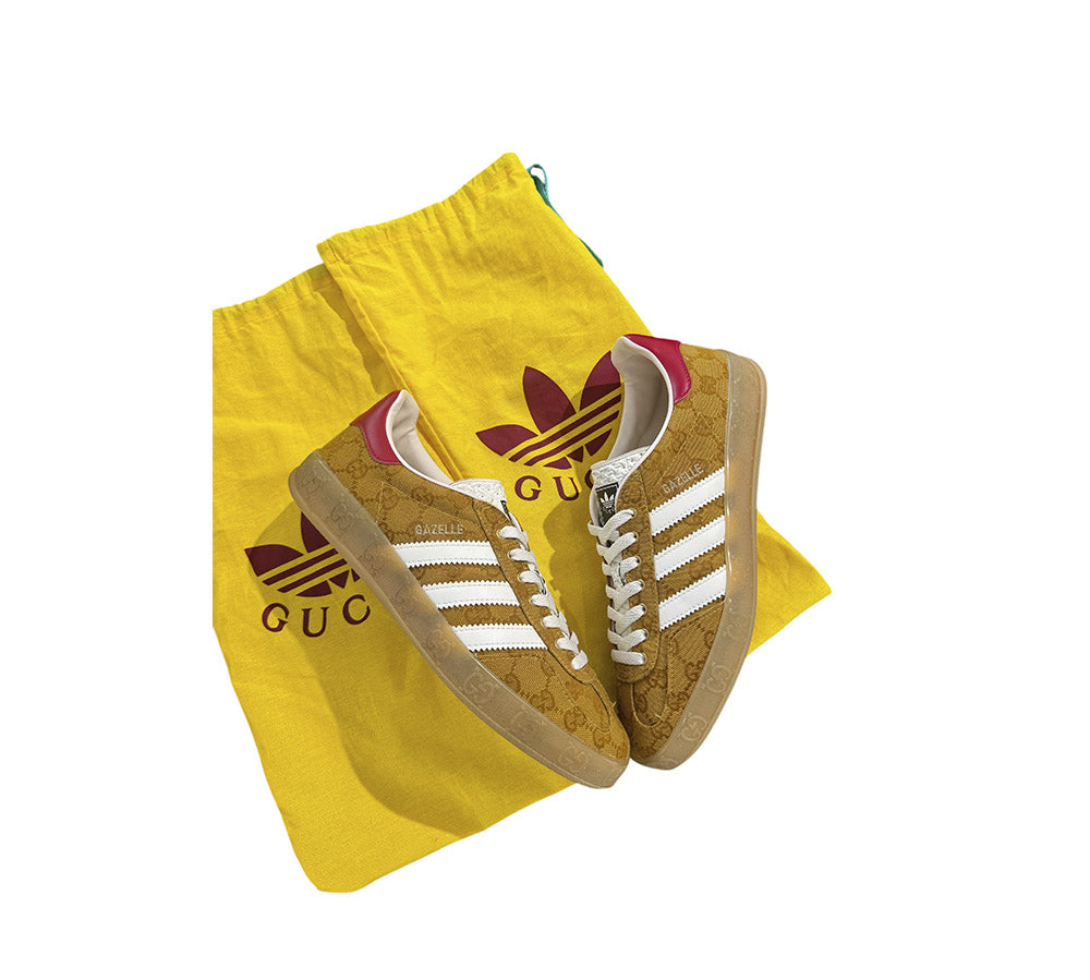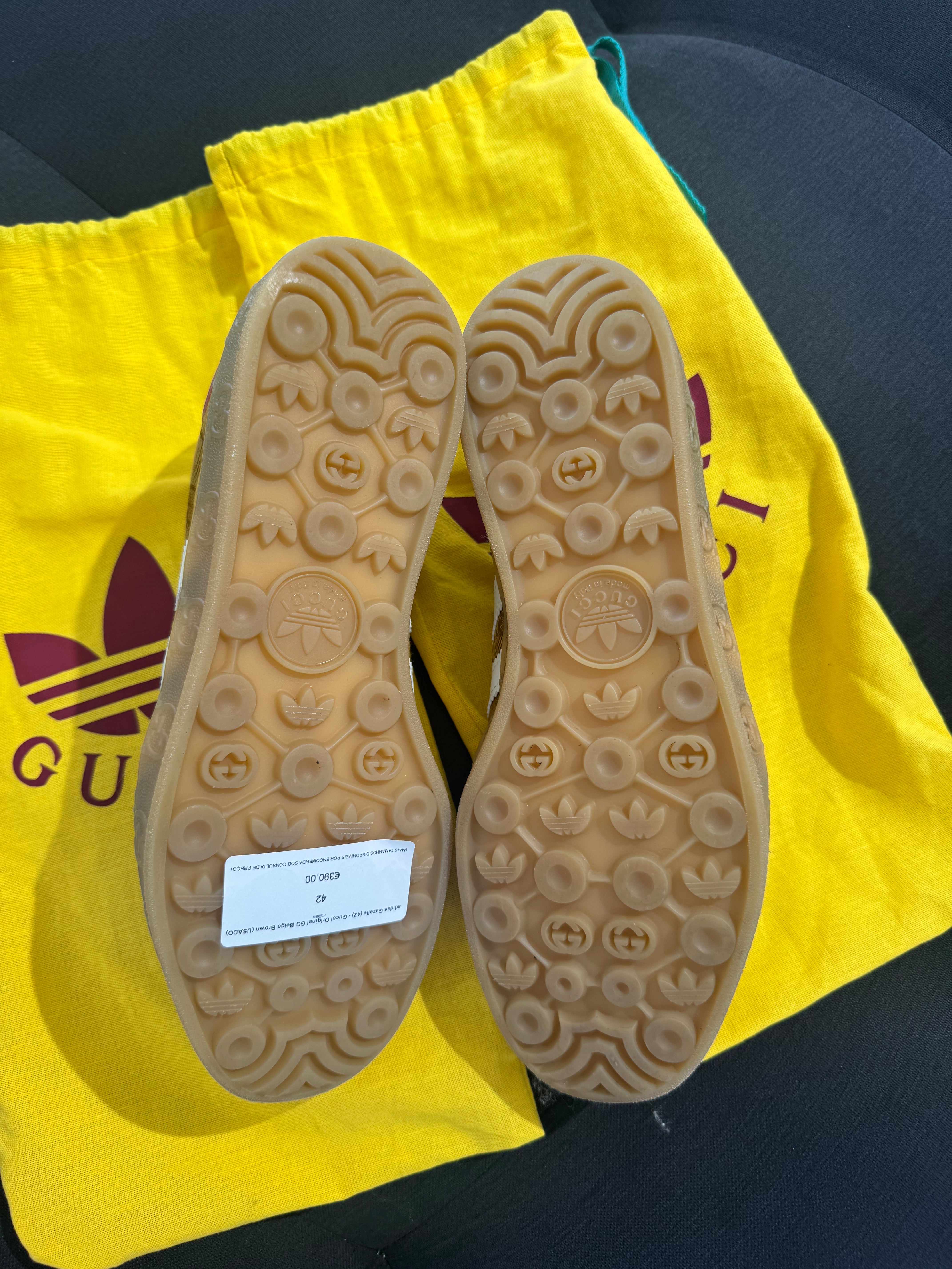 Fruto da colaboração entre adidas e Gucci, estas Gazelle em tamanho 42 elevam o clássico sneaker com o monograma GG sobre base bege e castanha. O resultado é um híbrido entre herança desportiva e luxo italiano, perfeito para quem quer vestir streetwear com pedigree.
