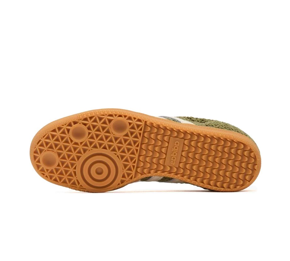 Estas sapatilhas adidas Samba OG são uma reinterpretação moderna e artesanal do clássico modelo de futebol de pavilhão, fazendo parte do Crochet Pack. O corpo da sapatilha abandona o couro tradicional para adotar uma construção em malha/croché espesso (crochet knit), conferindo-lhe uma textura tátil e um look de verão com um toque artesanal. A cor dominante é o Orbit Green (um tom Verde mineral e fresco), que cobre a maior parte do cabedal em croché. O modelo mantém os elementos icónicos, como o reforço em forma de "T" na biqueira e a lingueta tradicional, que se apresentam em Couro de cor Creme/Branco Sujo (Cream White). As três riscas serrilhadas (serrated 3-Stripes) e a aba do calcanhar são também em Branco Sujo contrastante, e toda a sapatilha assenta na intemporal e signature sola de borracha Gum.