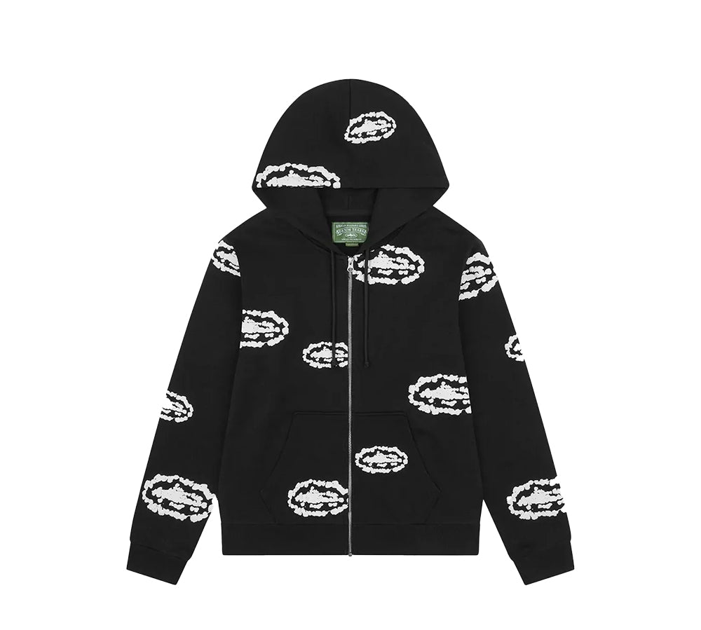 A Corteiz x Denim Tears Island Wreath Zip Hoodie na cor Black é uma peça de colaboração que funde a identidade gráfica de Londres com a narrativa histórica de Tremaine Emory. Confeccionada em moletão de algodão de alta densidade em preto profundo, esta hoodie apresenta um corte relaxado com fecho frontal completo e capuz estruturado. O design é centrado na fusão dos logótipos: a emblemática coroa de flores de algodão da Denim Tears envolve a silhueta da ilha de Alcatraz da Corteiz, criando um grafismo circular em contraste branco que simboliza a intersecção entre a herança da diáspora africana e a cultura de rua britânica, resultando numa peça visualmente poderosa e de alto valor cultural.