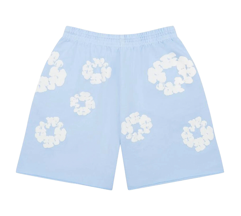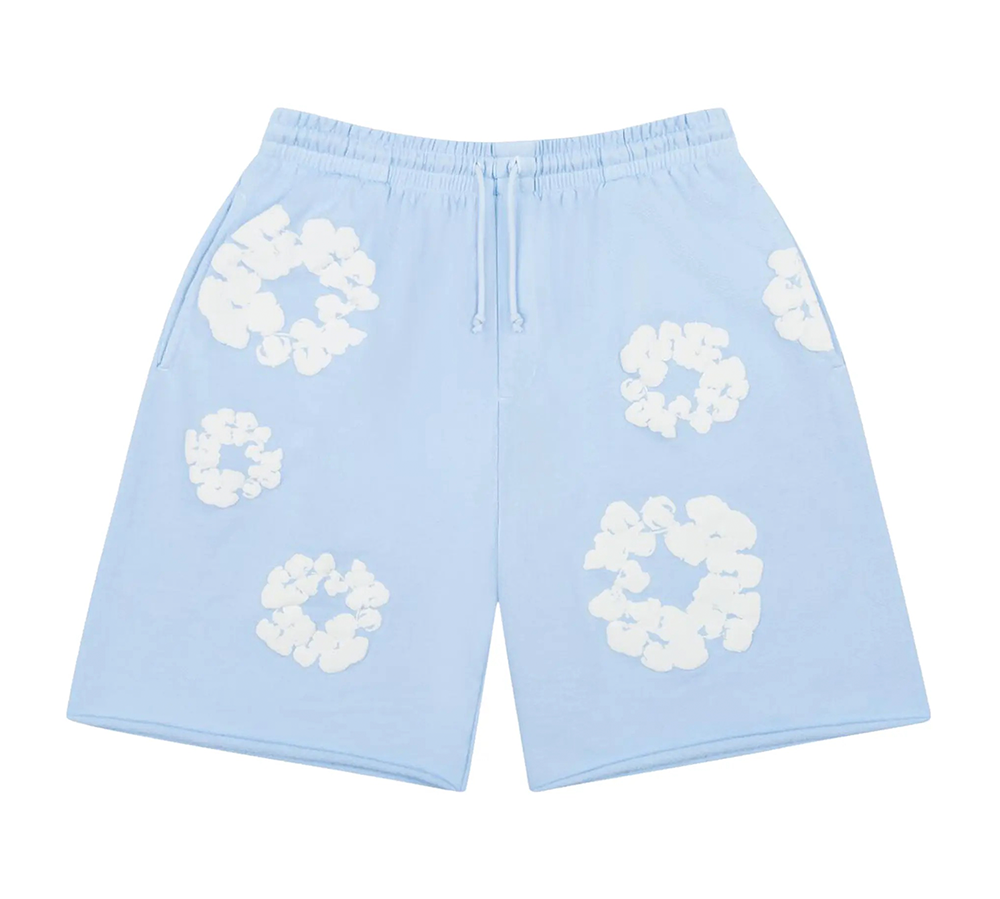 O Denim Tears The Cotton Wreath Shorts na cor Baby Blue (azul bebé pálido) é uma peça essencial do streetwear de luxo com uma forte mensagem cultural, concebida por Tremaine Emory. Confeccionado em algodão fleece (moletão) de alta qualidade, este calção de corte relaxed e descontraído apresenta o padrão icónico "Cotton Wreath" (Coroa de Algodão) estampado em puff print branco por toda a peça, criando um contraste tátil e visual ousado. O design inclui cintura elástica com cordão e simboliza a homenagem da marca à história afro-americana, garantindo um estilo de declaração inconfundível.