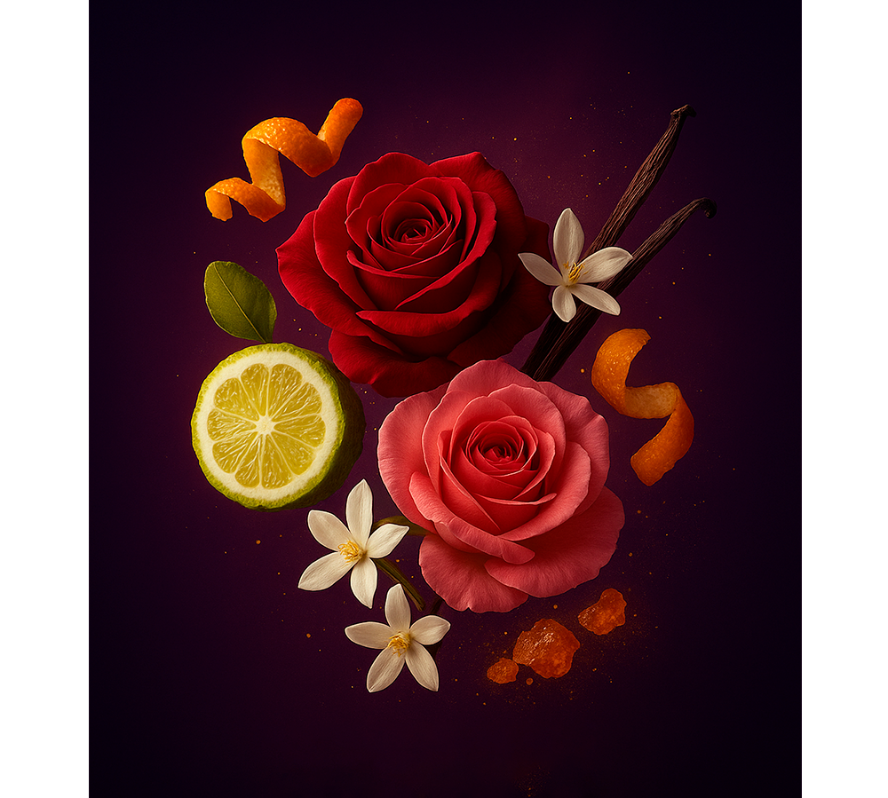 Coração: Rosa Búlgara, Rosa Turca, Jasmim Egípcio.