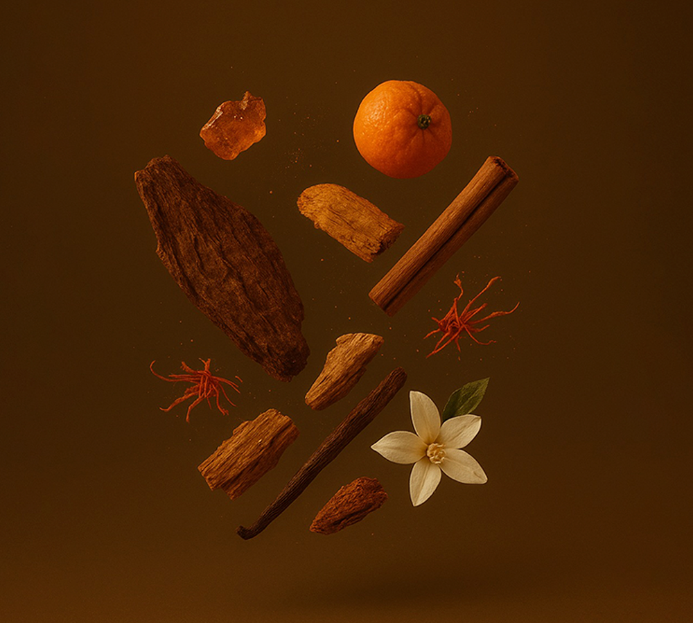 A composição é concisa na lista de ingredientes, mas complexa e rica no aroma, criando uma harmonia inebriante de notas quentes e licorosas.