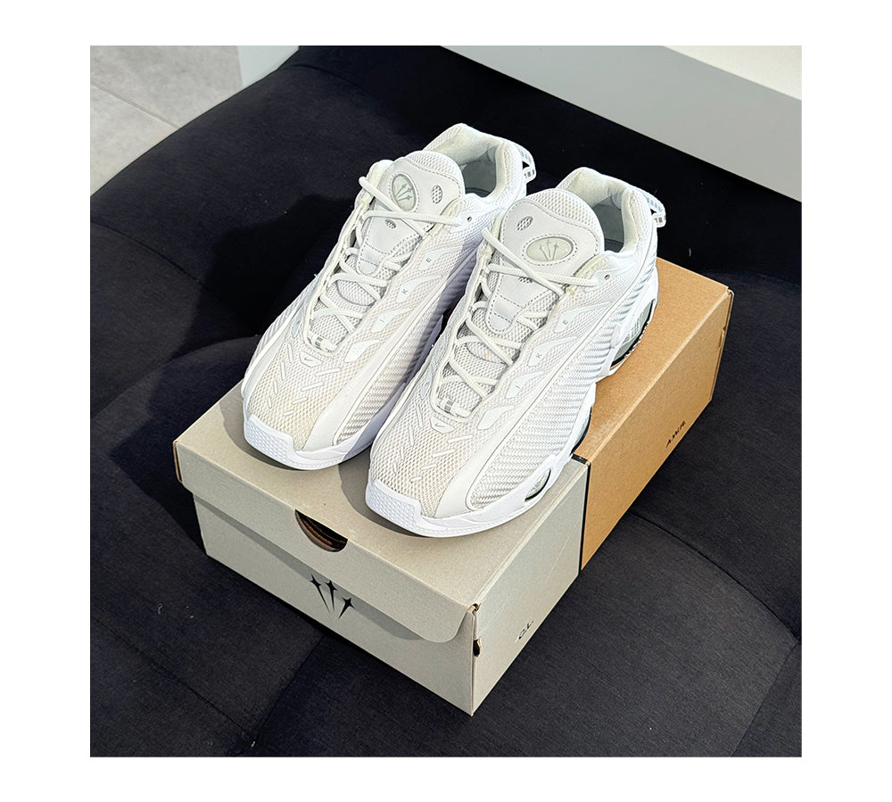 O Nike NOCTA Glide na cor White Chrome, uma colaboração com Drake, eleva um clássico do basquetebol a um patamar de streetwear futurista. Este par, usado mas em excelente estado, traz de volta a estética arrojada com o seu upper branco em malha respirável, detalhes cromados vibrantes e a icónica entressola inspirada no Zoom Flight 95. A sua silhueta volumosa e os pods circulares no calcanhar garantem um look que não passa despercebido, mantendo o conforto e o estilo que se espera de uma peça NOCTA.