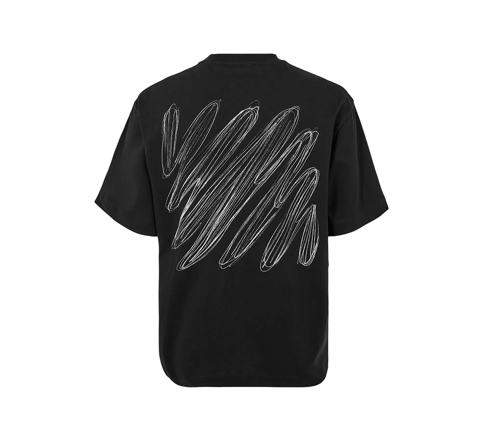A Off White c/o Virgil Abloh Scribble Diags T-shirt na cor Black (Preto) é uma peça fundamental do streetwear de luxo conceptual de Virgil Abloh, reinterpretando o icónico logótipo da marca com um toque artístico e descontraído. Confeccionada em jersey de algodão puro de alta qualidade, esta t-shirt de fit relaxado (relaxed-fit) apresenta um design minimalista na frente. O destaque recai nas costas, onde o padrão "Diag" — as listas diagonais distintivas da Off-White — é apresentado num estilo "Scribble" (rabisco) bordado a branco ou estampado em relevo, conferindo-lhe uma estética gráfica e "inacabada" que define a irreverência e o branding imediato da marca.
