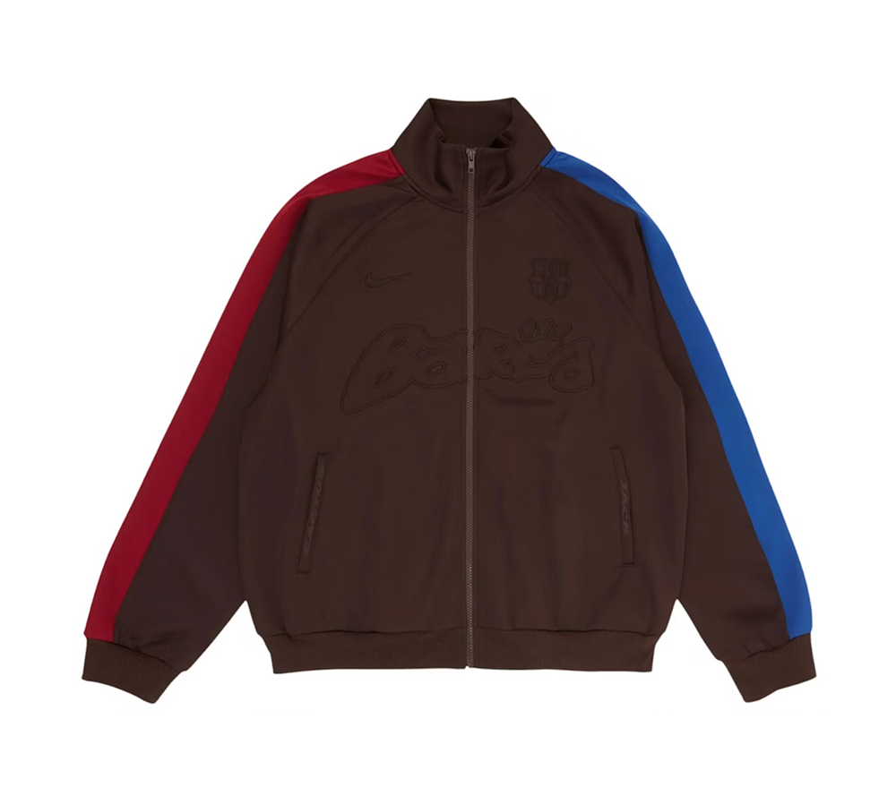 Com um design que faz lembrar as peças clássicas de vestuário de futebol, esta jaqueta tem a gola e os punhos canelados para um conforto extra, e o fecho de correr completo na parte da frente. O logótipo da Nike e do FC Barcelona estão bordados no peito e o logótipo Cactus Jack do rapper está na parte de trás, com detalhes gráficos.