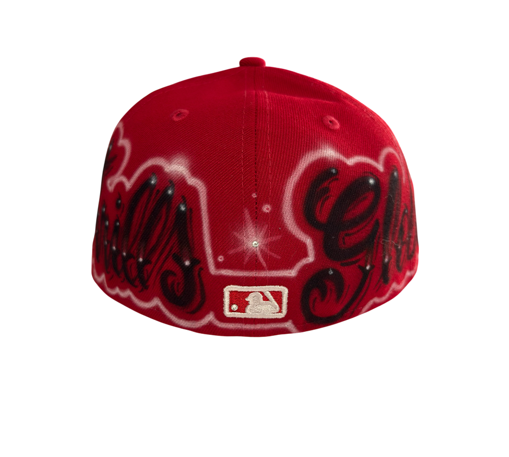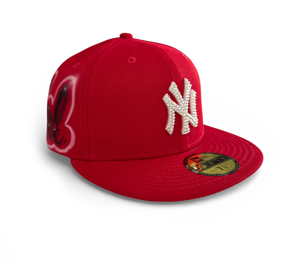 O New Era New York Yankees MLB Essential - Custom Red na cor vermelho é uma afirmação de estilo audaz que transforma o design desportivo mais reconhecido do mundo numa peça de arte urbana exclusiva. Confeccionado em algodão de alta qualidade com a clássica coroa estruturada e ajuste fixo (fitted), este modelo destaca-se pelo lendário logótipo "NY" frontal, inteiramente cravejado com cristais brilhantes para um acabamento de luxo. A estética é elevada por uma personalização artística em airbrush que percorre as laterais e a traseira, exibindo grafismos estilizados das palavras "Thrills Global" em tons de branco e cinza, criando um contraste dinâmico que funde a herança da Major League Baseball com a irreverência do streetwear contemporâneo.