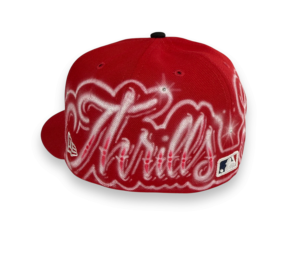 O New Era Philadelphia Phillies MLB Authentic Collection On-Field Game - Custom Red na cor vermelho é uma peça de statement que eleva o boné oficial de jogo a um novo patamar de exclusividade e arte urbana. Confeccionado em poliéster de alta performance com a icónica coroa estruturada e ajuste fixo (fitted), este modelo destaca-se pela personalização luxuosa do logótipo "P" frontal, cravejado com cristais brilhantes, e por um grafismo artístico em airbrush branco que envolve as laterais e a traseira. Unindo a estética desportiva clássica da MLB ao maximalismo do streetwear personalizado, este boné apresenta detalhes únicos de design que transformam um acessório de campo numa peça de coleção vibrante e cheia de atitude.