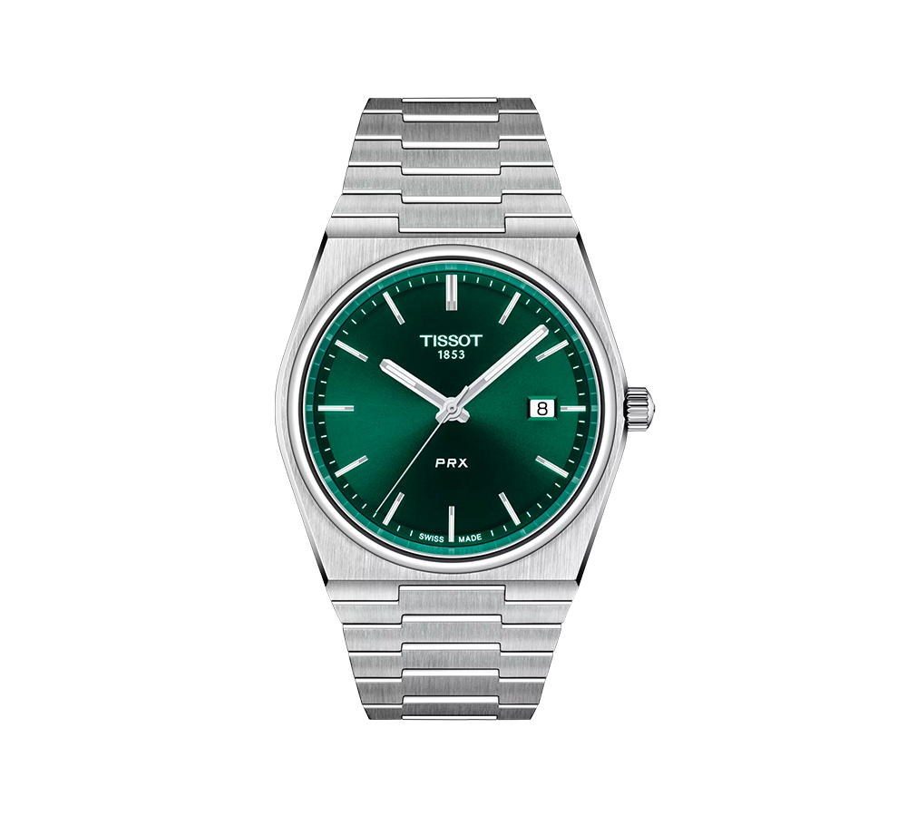 Uma versão em verde escuro que reforça o caráter elegante do PRX, com o mostrador sunburst a destacar a profundidade da cor. Um relógio para quem quer fugir do clássico preto ou azul sem perder sobriedade.