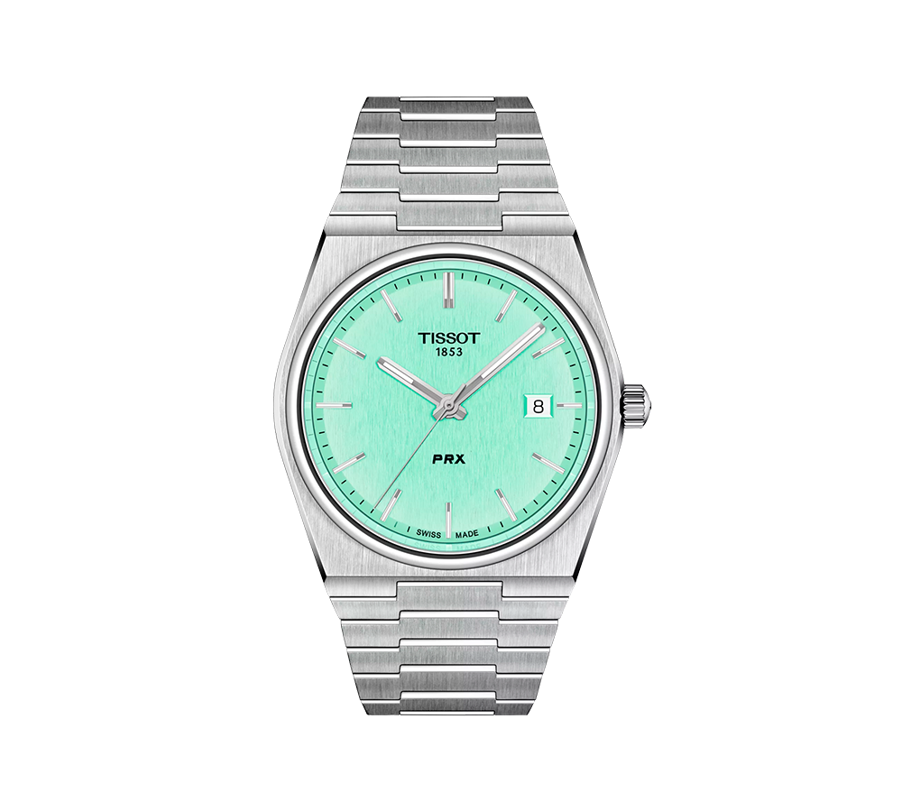 Este PRX traz um toque inesperado com mostrador verde claro, mantendo o design geométrico que consagrou a coleção. A cor pastel oferece frescura ao visual, criando uma peça moderna mas com toda a precisão da relojoaria suíça.